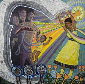 Utilizing personal and appropriated iconic imagery, Iconographic Visions instigates social and political change and evokes compassion as the artists’ works compel the viewer to confront the tumultuous political climate and social issues facing us today. Through colorful encaustic works, Julia Dzikiewicz challenges art lovers to explore a political landscape while being mesmerized by her mix of bold bright imagery and multi-layered three dimensional crystal and metallic elements. Michael Fischerkeller conveys his vision through meticulously wrought spray painted stencil work inspired by the tools and techniques of street artists and the imagery of pre-Raphaelite masterpieces.