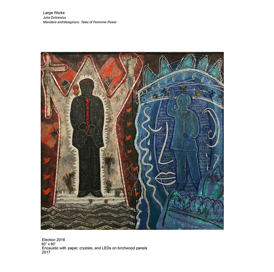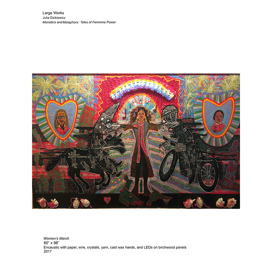 Monmouth University’s Pollak Gallery recently mounted a breathtaking solo retrospective of Julia Dzikiewicz’s ( Je-kev-ich’s) work entitled Women’s History: Passion and Protest. After the success of that powerful exhibition we would like to propose her latest body of work known as “Monsters and Metaphors: Tales of Feminine Power” for your consideration after witnessing first-hand how much it engages and inspires those who experience it.