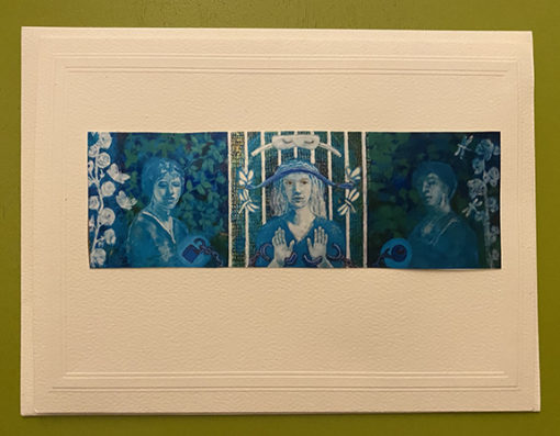 Susan B Anthony once said “Women are in chains and the sad part is that they don’t even know it….” This quote inspired the painting of a Suffragist who has lost her chains. The woman in the center of the painting is amazed. The blindfolds lift from her eyes, as she now sees the world with new eyes. She sees the world of possibility, instead of seeing the world through the constricted view of gender roles of the time. As her mind frees, the chains fall off her wrists and the blindfold falls from her eyes.