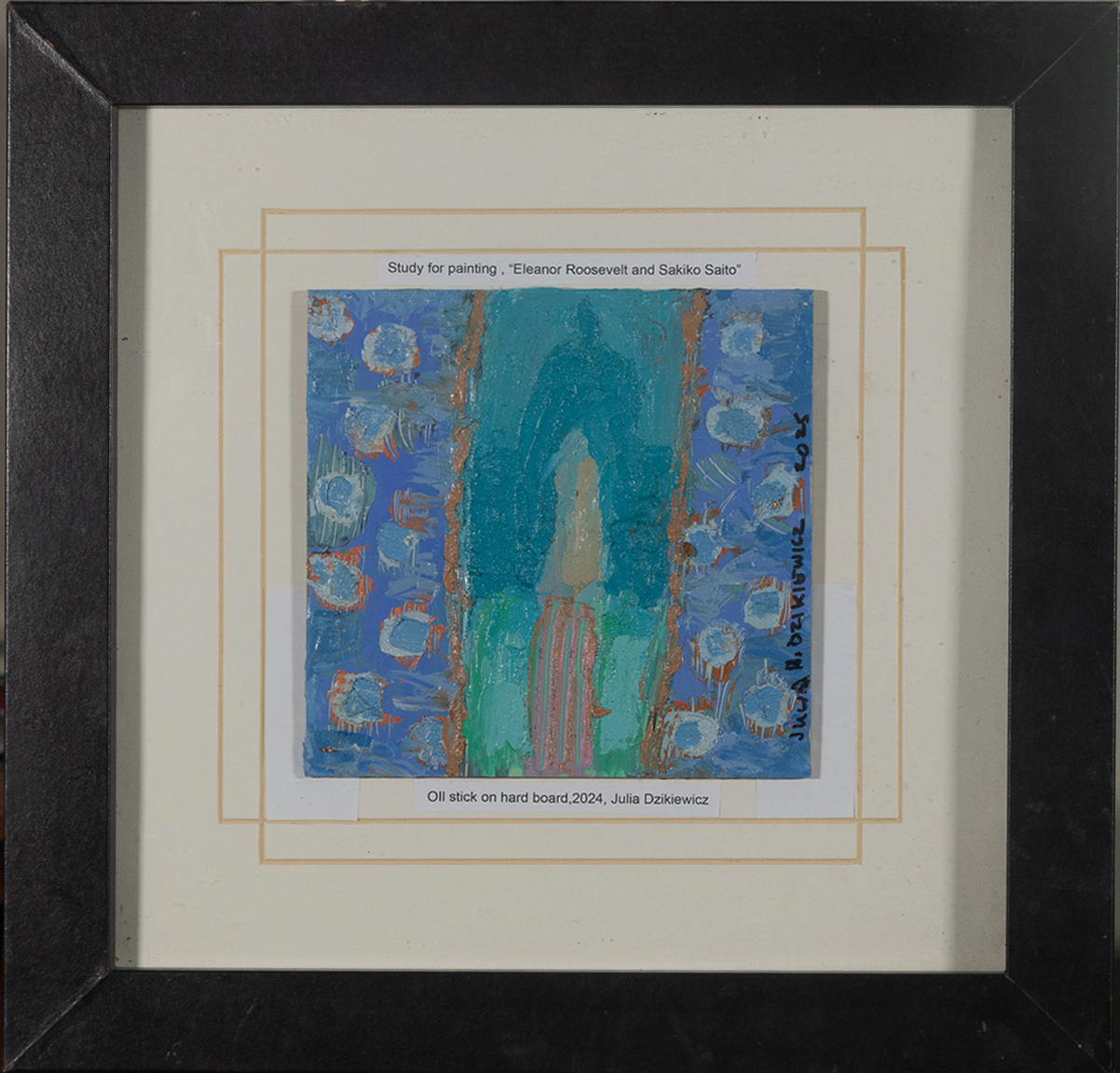 Outside measurements of work is 13″ x 13″ with black frame. Size inside mat is 6 ” x 6″.